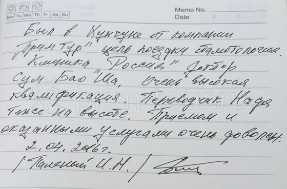Большое спасибо за радушный прием, профессионализм. Благодарю всех сотрудников клиники, переводчика Надю. Желаю вам отличного здоровья, счастья в личной жизни, успехов в труде. До новых встреч. С уважением Александр. 22.10.18